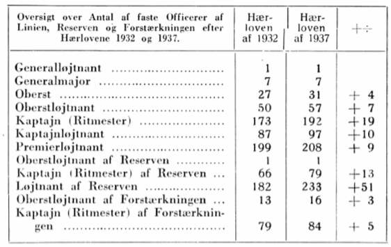 Med de svage Liniekadrer, som Hæren efter Loven af 1922 raadede øver, da den var reduceret fra 52 Batailloner til 35 med Afskedigelse af over 1000 Liniebefalingsmænd, maatte det vær nepligtige Befalingsmandskorps komme til at spille en overmaade vigtig Rolle for Hærens Kampdygtighed og Uddannelse. Kun 25 % af de faste Befalingsmamd var af Linien, Resten af Reserven.