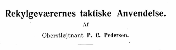 Rekylgevæ rerne er underlagt den Ba taillon , Kom pagni og Deling, i hvis K am plinie de sættes in d “ . Dette har foranledige t K ap ta jn Jessen til øverst Spalte 190 at udtale, at efter m in Opfattelse af K om m ando forholdene „skal Rekylgevæ rdelingsføreren P r e m ierlø jtnan t N. N., der med 2 R ekylgevæ rsek tioner-tilfældigt komm er ind i Fod folksdeling sføreren , K o rp o ral P. F.s Deling, være lænkehunden Lil at følge K o rp o ra lens D eling under hele Stagets Gang“ , hvore fter K ap tajnen ironisk tilfø je r: „Saa er K om m an do fo rh oldene ra tionelle .“
